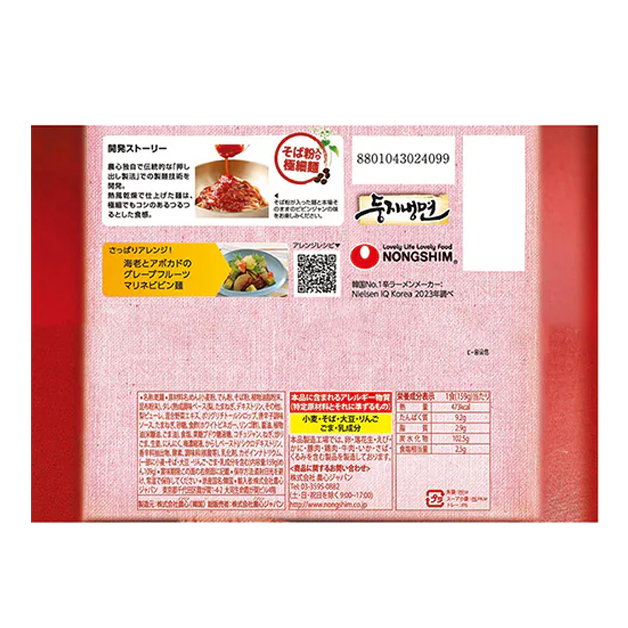 ● 原 材 料 名 めん(小麦粉、でん粉、そば粉、植物油脂粉末、昆布粉末)、タレ(熟成調味ベース(梨、たまねぎ、デキストリン、その他)、梨ピューレ、混合野菜エキス、ポリグリチトールシロップ、唐辛子調味ソース、たまねぎ、砂糖、食酢(ホワイトビネガー、リンゴ酢)、醤油、植物油(米糠油、ごま油)、食塩、果糖ブドウ糖液糖、コチュジャン、ねぎ、炒りごま、生姜、にんにく、梅濃縮液、からしペースト) / シクロデキストリン、香辛料抽出物、酵素、調味料(核酸等)、乳化剤、カゼインナトリウム、(一部に小麦・そば・大豆・りんご・ごま・乳成分を含む)