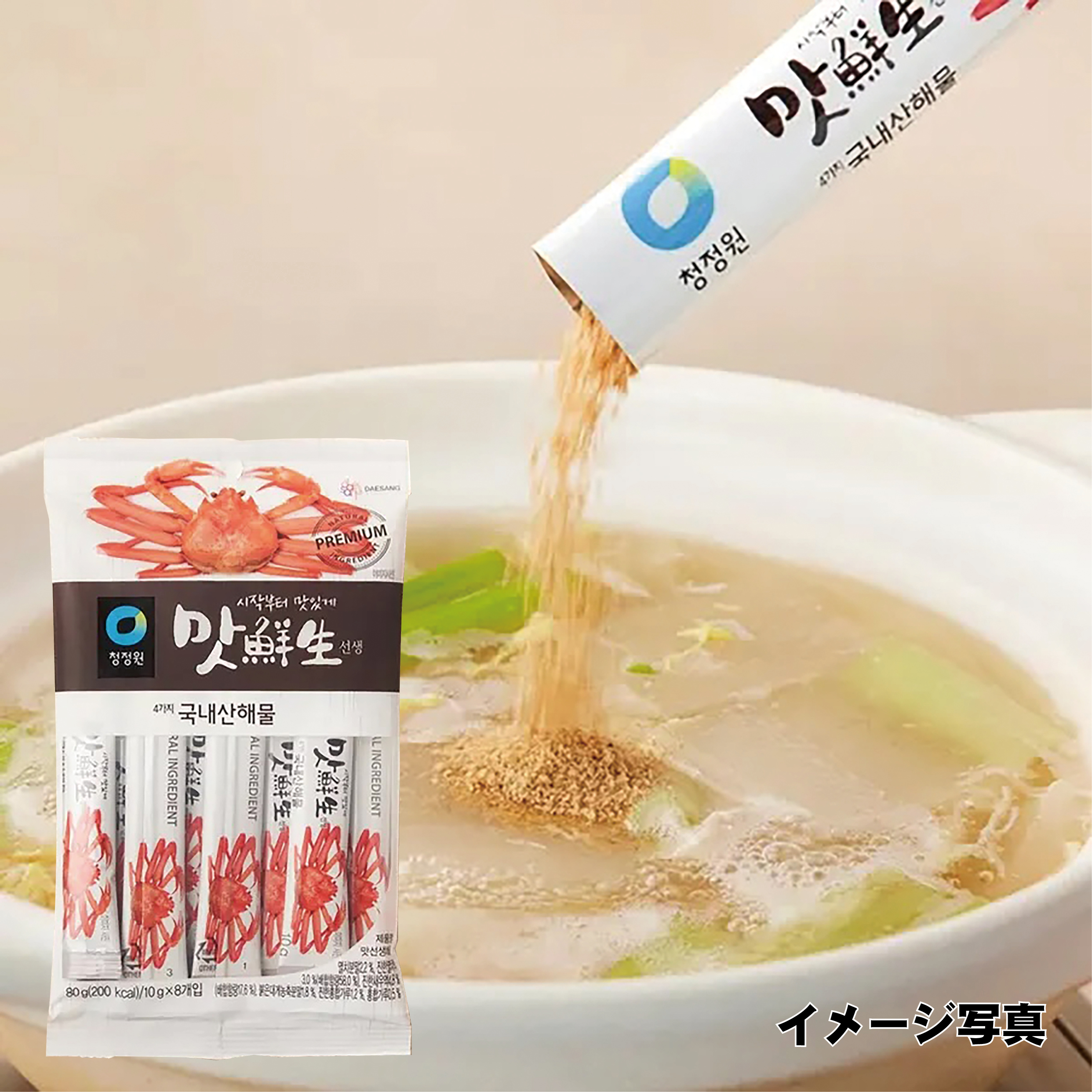 ● 原材料名 海鮮シーズニング(カタクチイワシ粉末、ムール貝粉末、黒こしょう)、食塩、ぶどう糖、粉あめ、えびエキス、しょうゆ加工品、魚介シーズニング、カタクチイワシエキス、酵母粉末、野菜だし、ベニズワイガニエキス、米粉、ムール貝粉末、赤唐辛子粉/糊料(増粘多糖類)、甘味料(カンゾウ)、酒精、香辛料抽出物、(一部にえび・かに・小麦・乳成分・大豆・りんごを含む)