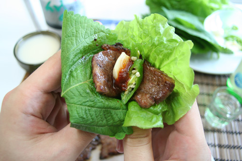 ▲サンチュと胡麻の葉を重ねてその上に骨のところを切ったカルビと薄く切ったニンニク・青唐辛子を乗せます。それからサムジャンを付けて包んで口の中へ~