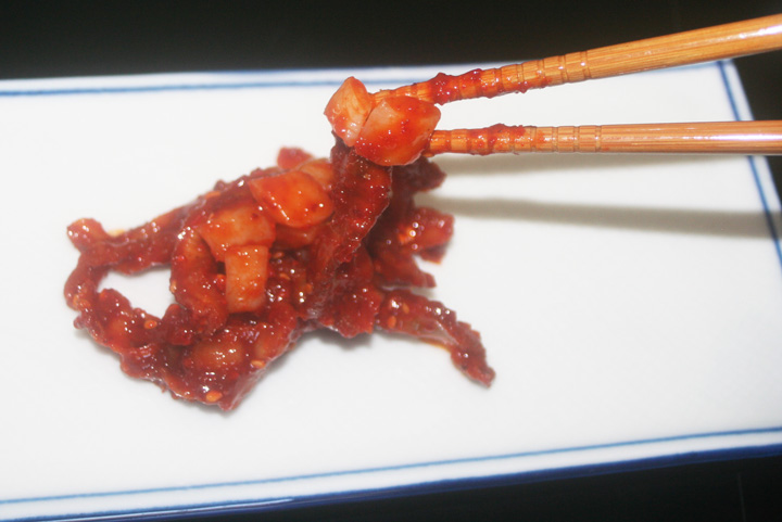 帆立ひもとつぶ貝とイカ入り/辛さと歯ごたえがクセになる。