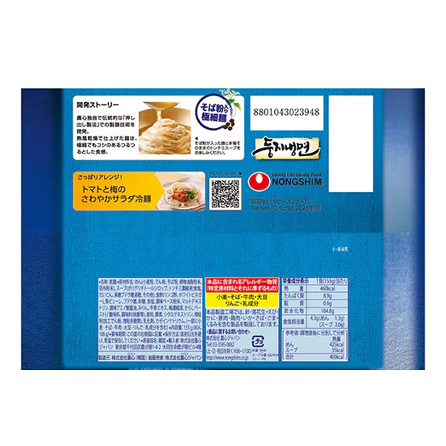 ● 原 材 料 名 めん(小麦粉、でん粉、そば粉、植物油脂粉末、昆布粉末)、スープ(ポリグリチトールシロップ、トンチミ濃縮液(食塩、だいこん、果糖ブドウ糖液糖、その他)、食酢(リンゴ酢、ホワイトビネガー)、梨ピューレ、ブドウ糖、砂糖、食塩、調味ベース粉末、マルトデキストリン、調味アミノ酸醤油、みりん、牛骨エキス、梅濃縮液、からしペースト) / 酸味料、調味料(核酸等)、香料、酵素、シクロデキストリン、増粘剤(加工でん粉、増粘多糖類)、乳化剤、カゼインナトリウム、(一部に小麦・そば・牛肉・大豆・りんご・乳成分を含む)