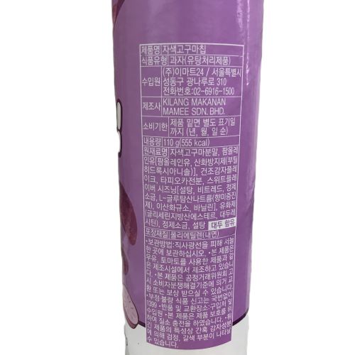● 成 分 紫いも粉末、パームオレイン油、乾燥ポテトフレーク、タピオカでん粉、スイートフレーバーシーズニング(砂糖、ビットレッド食塩、バニリン)、砂糖、塩/調味料(アミノ酸)、乳化剤、酸化防止剤(ブチルヒドロキシアニソール)、微粒二酸化ケイ素、(一部に大豆を含む)