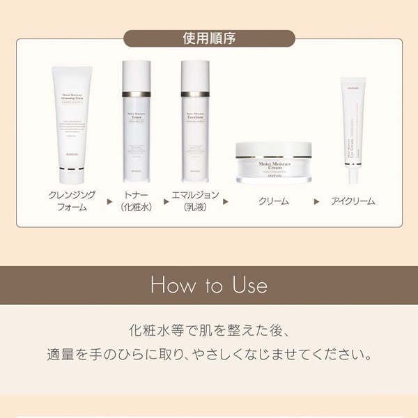 化粧水のあと、適量を手のひらにとりお肌のキメにそって顔や首になじませるようにつけてください。