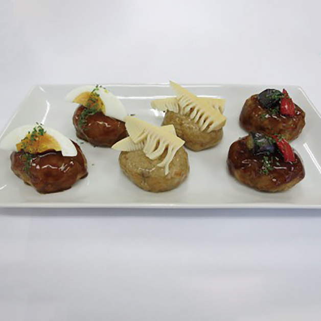 ● 原材料名 鶏肉(国産)、たまねぎ、パン粉、粒状植物性たん白、揚げ油(植物油)、牛脂、豚脂、しょうゆ、砂糖、食塩、果実酒、香辛料、卵白加工品/調味料(アミノ酸等)、酢酸Na、グリシン、リン酸塩(Na)、着色料(紅麹、ラック、カロチノイド)、香料、(一部に小麦・卵・乳成分・牛肉・大豆・鶏肉・豚肉を含む)