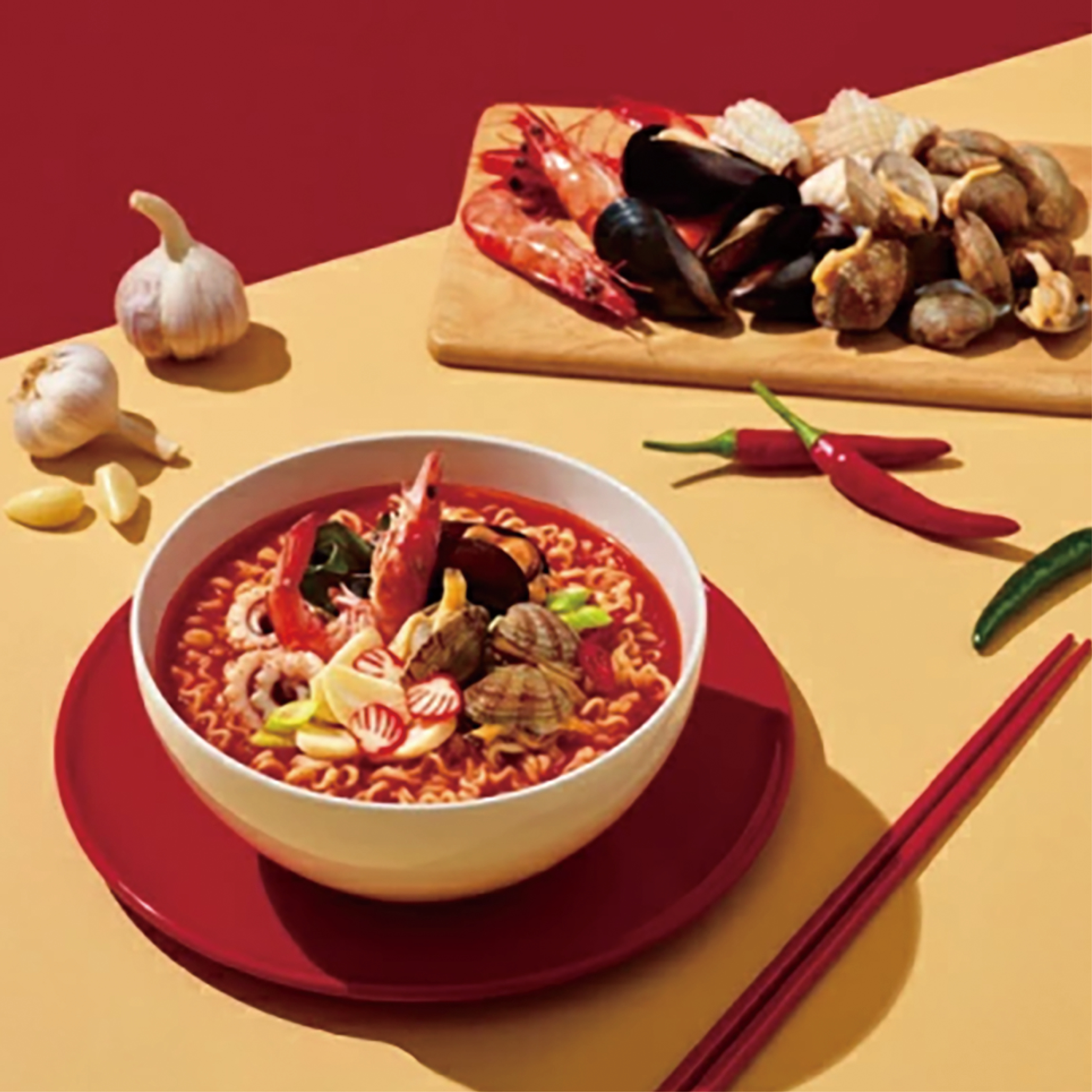 ● 原 材 料 名 油揚げめん(小麦粉、植物油脂、食塩、玉ねぎエキス)、スープ(食塩、砂糖、貝エキス、香辛料、貝シーズニング、唐辛子エキスパウダー、シーフードシーズニング、えびエキスパウダー、トマトシーズニング、唐辛子シーズニング)、かやく(にんじん、魚肉フレーク、海苔)/増粘剤(加工でん粉、グァーガム)、調味料(アミノ酸等)、香料、グリセリン、かんすい、着色料(パプリカ色素、カラメル、ビタミンB₂、コチニール)、乳化剤、香辛料抽出物、酸化防止剤(ビタミンE、カテキン)、pH調整剤、甘味料(ステビア、ソルビトール)、(一部にえび・小麦・大豆を含む)