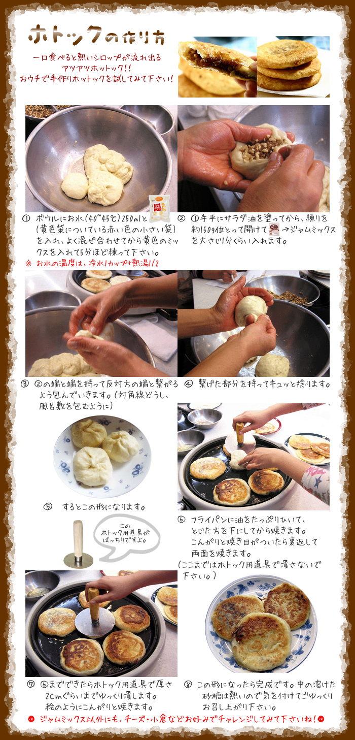 ● 商品特徴 フライパンで簡単に作れるホットックミックスです。粉にイーストが入っているので別途の準備が要りません。ホットックジャムにはピーナッツ粉が入って、香ばしい味がします。