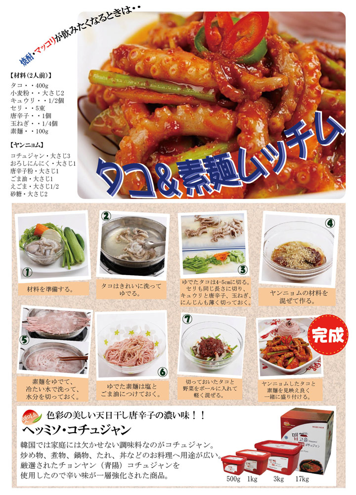 ● 商品特徴 厳選されたチョンヤン(青陽)コチュジャンを使用したので辛い味が一層強化された商品で辛い味を出す高級料理に適している商品です。本場韓国直輸入の最高のキムチブランドで、チゲ鍋、炒め料理、合え料理など幅広い韓国料理の薬味に使えます。特に魚の煮込み料理、チケ鍋には欠かせない必修的な調味料です。