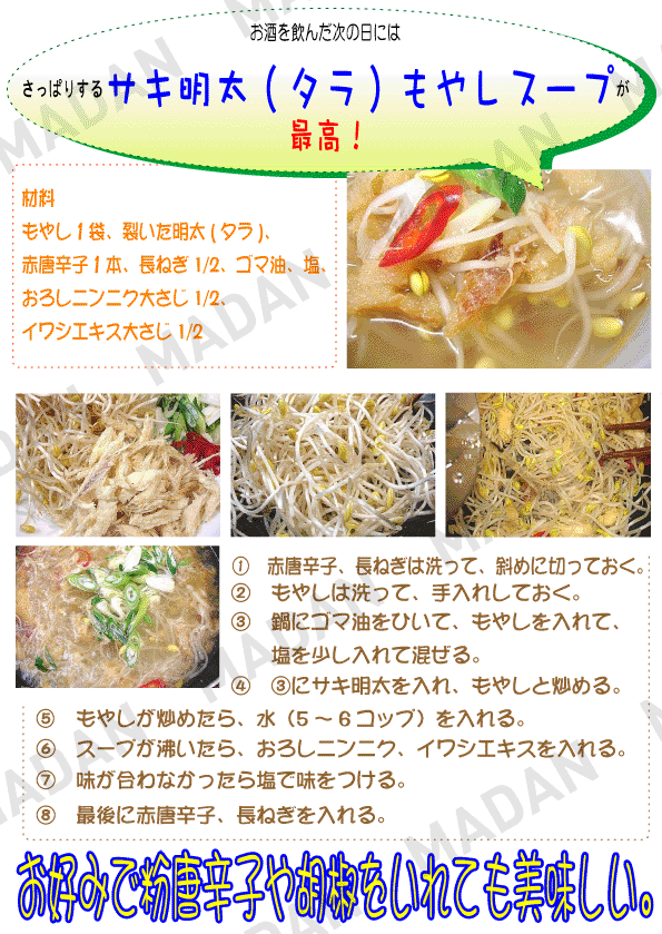 【 材料 】サキ明太……………約80gイワシエキス………大さじ1/2もやし………………1袋ごま油………………大さじ3赤唐辛子……………1本おろしにんにく……大さじ1/2長ネギ………………1/2アミの塩辛…………小さじ0.5(塩の代わりに)調味料(牛肉ダシダ・味鮮生・マンナ・カムチミの中、一つ)……大さじ1 約7g