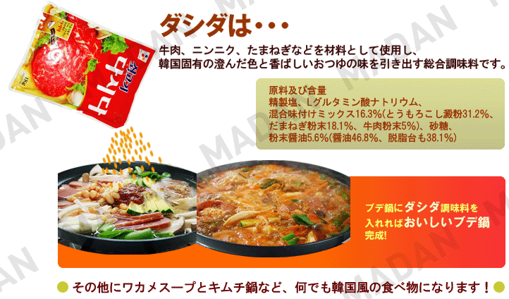 ● 商品特徴 チゲ鍋、チャーハン、スープなど料理全般にご使用いただけます。牛肉のダシのきいた、いい味に仕上がります。韓国では、チゲ鍋とかスープ類を作るとき、無くてはならない存在になりました。