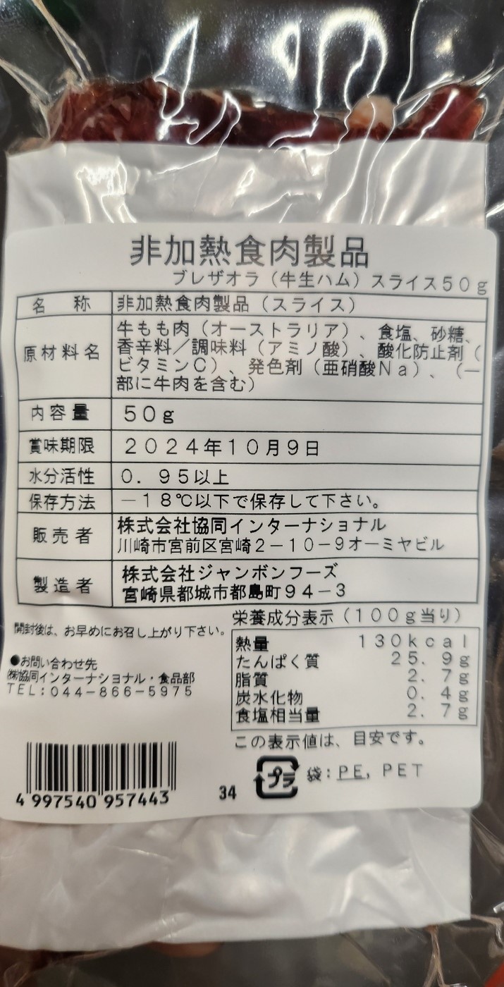 ● 成 分 牛もも肉(オーストラリア産)、食塩、砂糖、香辛料、調味料(アミノ酸)、酸化防止剤(ビタミンC)、発色剤(亜硝酸Na)、(一部に牛肉を含む)