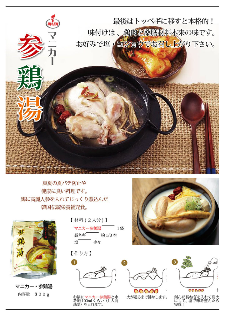 レトルト参鶏湯定番中の定番マニカ参鶏湯は、手間暇のかかる参鶏湯料理を簡単・便利に提供していただけます。