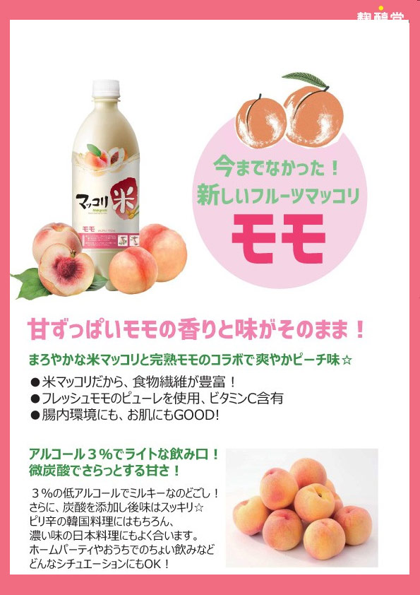 みずみずしい桃の味と香りがそのまま楽しめるフルーツマッコリ、「麹醇堂米マッコリモモ」が誕生しました。乳酸菌のやわらかい酸味と米本来の甘味にモモ果汁をブレンドし、爽やかなピーチ味のマッコリに。ベースとなる米マッコリは米を蒸さずに醸造したため、他のマッコリよりアミノ酸や植物繊維が豊富です。また、桃の果汁入りでビタミンCも含有されています。